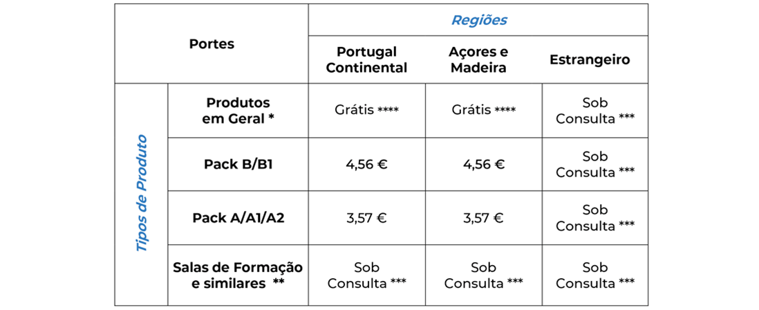 Os portes de envio definidos pela ESR, tendo em conta o tipo de produto e região, são os seguintes: